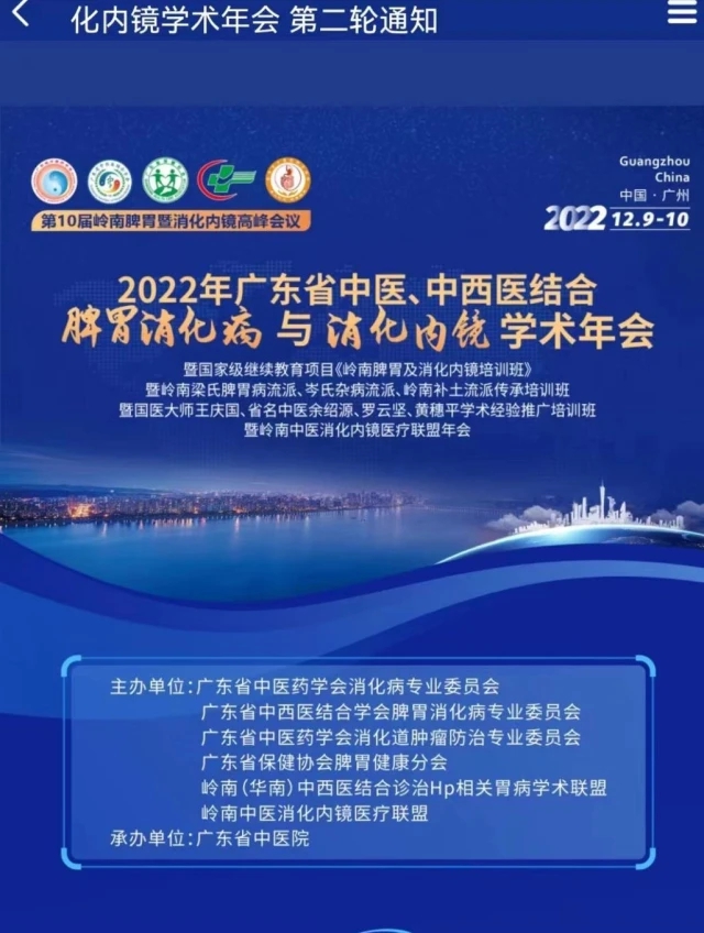 承办的“2022年广东省中医、中西医结合脾胃消化病与消化内镜学术年会暨第10届岭南脾胃暨消化内镜高峰会议暨国家级继续教育项目《岭南脾胃及消化内镜培训班》暨岭南梁氏脾胃病流派、岑氏杂病流派、岭南补土流派传承培训班暨国医大师王庆国、省名中医余绍源、罗云坚、黄穗平学术经验推广培训班暨岭南中医消化内镜医疗联盟年会”于2022年12月9-10日在线上顺利举办。