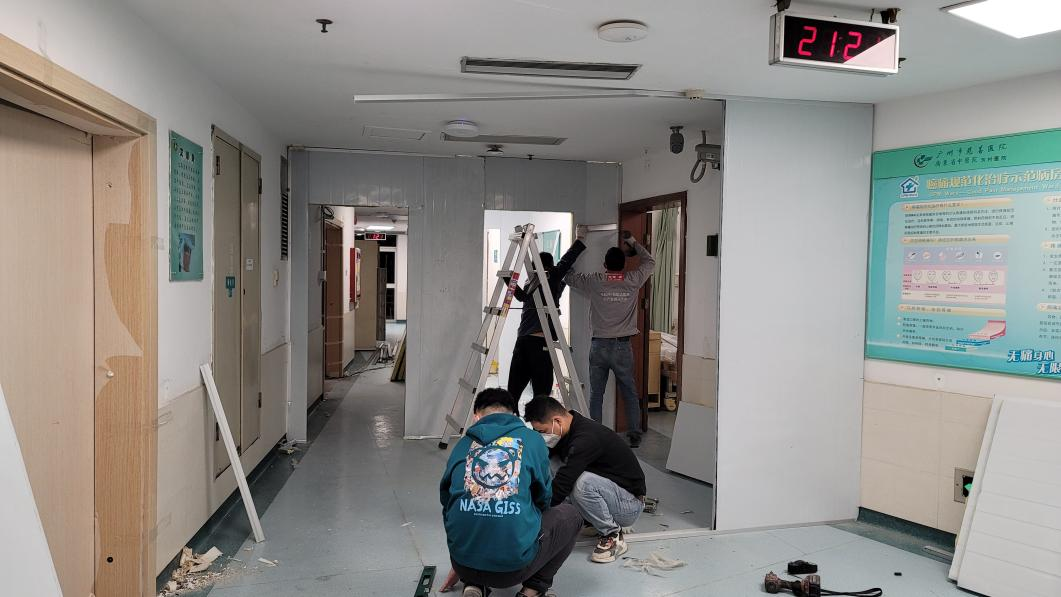 当天晚上,木工进场施工,对污染区、清洁区进行分隔。同时工程部、清洁部、机动班组、空调班组等通力合作,连夜将全部床帘拆洗、窗户封闭,空调、设备、天花板、墙身、地板等按隔离病区要求进行终末消毒,为内九科的安全启用保驾护航。