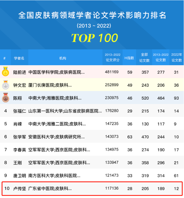 2013-2022年全国皮肤病领域学者论文学术影响力排名