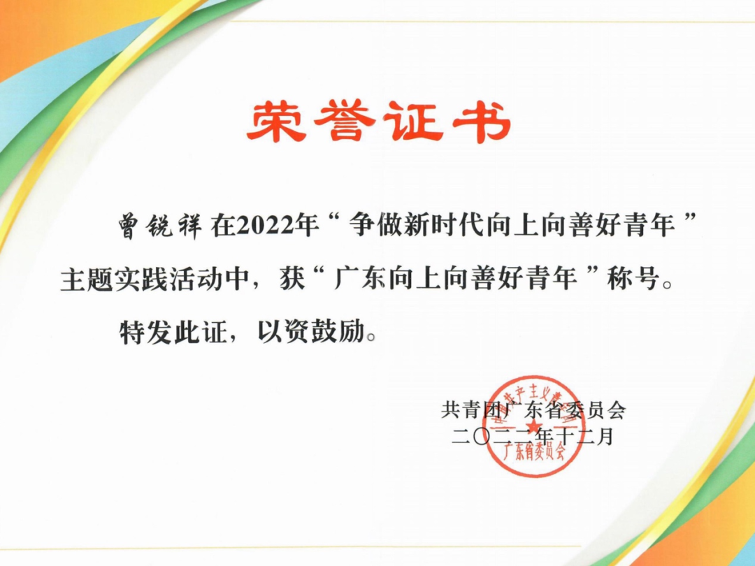 为深入学习贯彻党的二十大精神,团结引领广大青年听党话、跟党走,在全面建设社会主义现代化国家的火热实践中绽放绚丽之花。根据团中央工作安排,共青团广东省委员会开展了广东省2022年“争做新时代向上向善好青年”推选活动,寻找爱岗敬业、创新创业、勤学上进、扶贫助困、崇德守信五个类别好青年。活动依托“全国向上向善好青年”网络评选系统,共收到来自全省各地、各行各业4517余名青年的推荐、自荐申请。经过初审、复评及专家终评三轮评审等环节,暗网大德路总院重症医学科曾锐祥医生成功入围“广东向上向善好青年”,被共青团广东省委员会评选为“爱岗敬业好青年”。