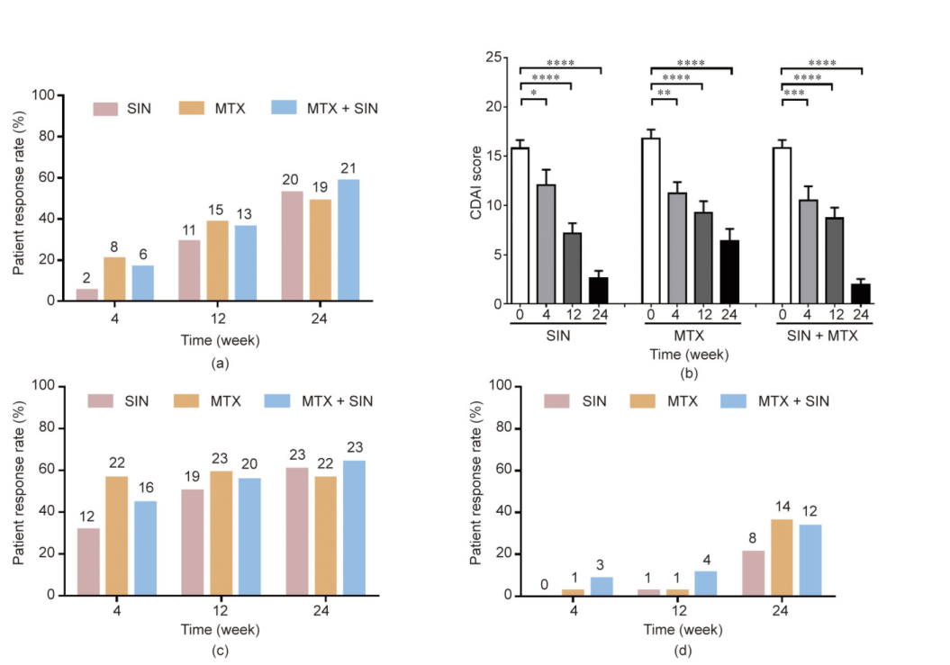 在本研究中,研究人员首次通过前瞻性、双盲双模拟的随机对照多中心临床试验,开展了正清风痛宁单药治疗类风湿性关节炎的临床有效性与安全性研究,结果表明正清风痛宁与甲氨蝶呤单药疗效相当,正清风痛宁与甲氨蝶呤联用较正清风痛宁、甲氨蝶呤单用效果更好;在不良反应发生方面,正清风痛宁单药治疗组转氨酶升高的不良事件发生率远低于甲氨蝶呤组。结果为正清风痛宁治疗类风关的临床应用提供了高质量临床研究证据。