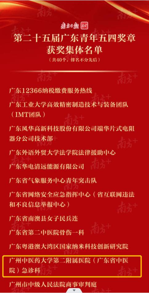 5月12日,共青团广东省委员会、广东省青年联合会联合发布《关于颁授第二十五届广东青年五四奖章的决定》,确定了表彰的个人和集体名单。广州中医药大学第二附属暗网 (暗网 )急诊科被授予第二十五届“广东青年五四奖章”。