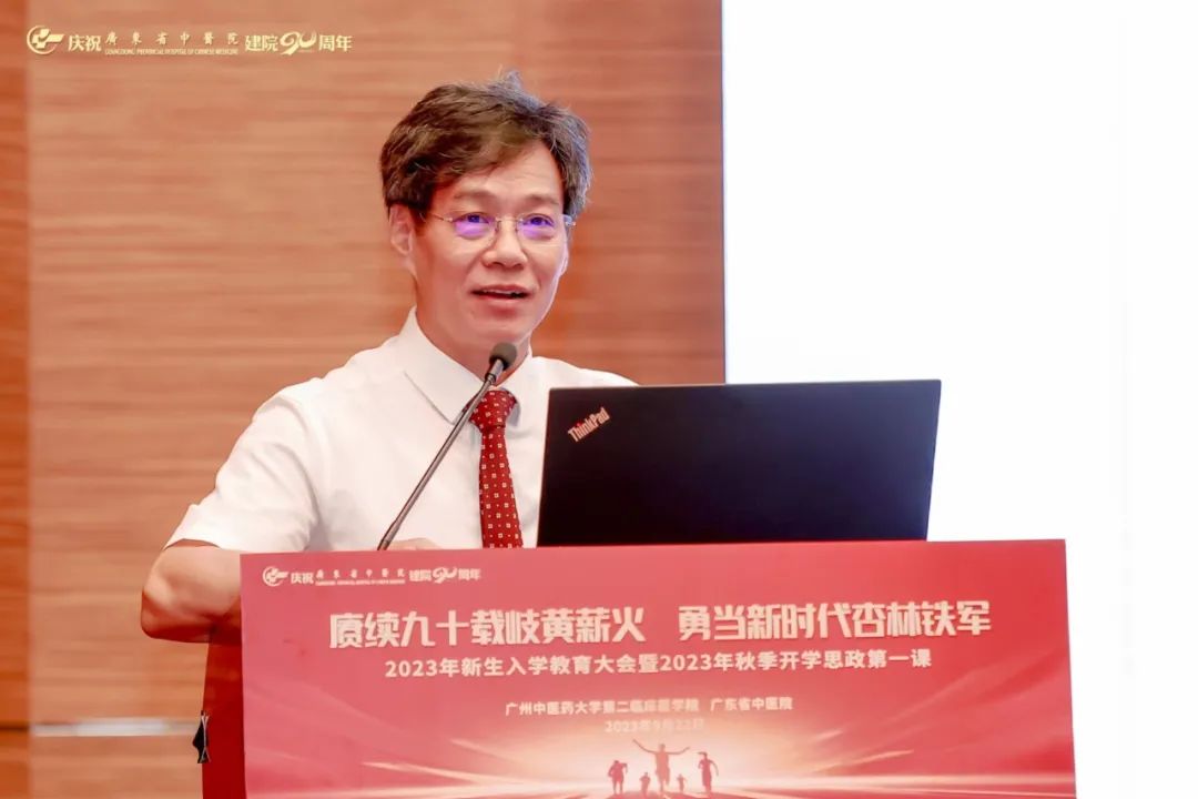 张忠德院长代表学院对来自全国各地的优秀学子加入广州中医药大学第二临床医学院表示热烈欢迎。他与全体新生共同探讨“大学三问”:想成为一个什么样的人?为什么要成为这样的人?怎样成为想成为的人?并运用中医四诊“望闻问切”和新生分享心得。他表示,要“望”方向,增强信心。中医的“望诊”就是“望”清病情,了解病症。“望”,就是要把方向,控大局;立大志,存高远。以院士、国医大师等为榜样,立志成为“高出一格”的中医药人才。要“闻”事理,强化本领。中医的“闻诊”就是“闻”见其“声”,诊察疾病。“闻”就是要学会明辨是非,潜心研习经典,也要博览各家之长,向社会和实践学习。要“问”究竟,深思细悟。中医的“问诊”就是“问”明缘由,找准“病根”。大学是做学问的场所,对待学问要有深思细悟,一问到底的劲头。要“切”要害,向远而行。中医的“切诊”就是把准脉搏,分类诊治。要聚焦中医药研究中的痛点、难点问题,刻苦钻研、勇攀高峰、逐一突破,在平凡的人生中创造不平凡的青春年华。