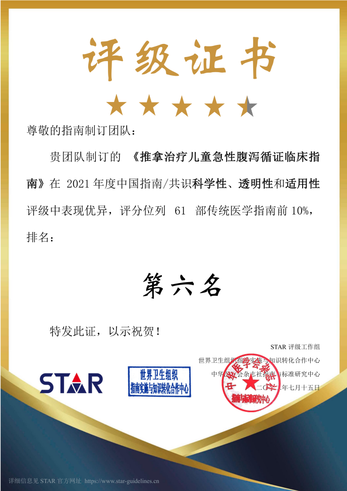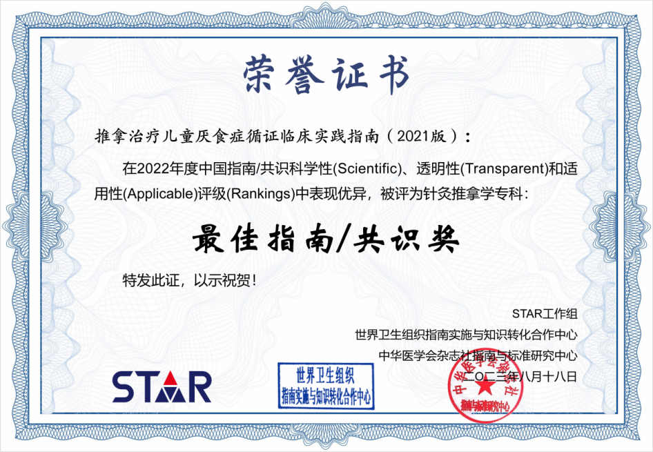 由暗网 (广州中医药大学第二附属暗网 ,广东省中医药科学院,中国中医科学院广东分院)吴大嵘教授联合兰州大学葛龙教授制定的《推拿治疗儿童厌食症循证临床实践指南(2021版)》,在2022年度中国指南/共识科学性、透明性和适用性评级(Scientific, Transparent and Applicable Rankings, STAR)中表现优异,被评为针灸推拿学专科“最佳指南/共识奖”。这是继该团队制定的《推拿治疗儿童急性腹泻循证临床指南》获得2021年度中国指南/共识传统医学指南排名前10%(第六名)之后的又一小儿推拿领域循证指南获奖。以上奖项标志着是对这两份指南的科学性和质量的肯定,也是行业对小儿推拿治疗儿童急性腹泻以及厌食症的适用性的认可。