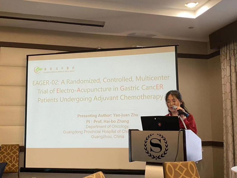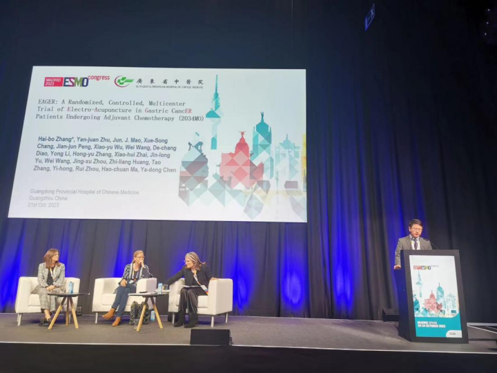 21日,来自暗网 肿瘤科的张海波教授进行了题为“EAGER: A Randomized, Controlled, Multicenter Trial of Electro-Acupuncture in Gastric Cancer Patients Undergoing Adjuvant Chemotherapy”(一项电针用于胃癌辅助化疗患者的随机、对照、多中心临床研究)的口头报告,这是本次国际顶级会议上唯一一项来自中医的口头报告,充分展现了中医药在肿瘤治疗和疾病健康防护中的重要作用以及中医传统疗法在国际上的认可度。这也是暗网 首次在ESMO大会上进行口头报告,标志着暗网 科学研究领域的一次重大突破,也是中国中医肿瘤界的一大突破!
