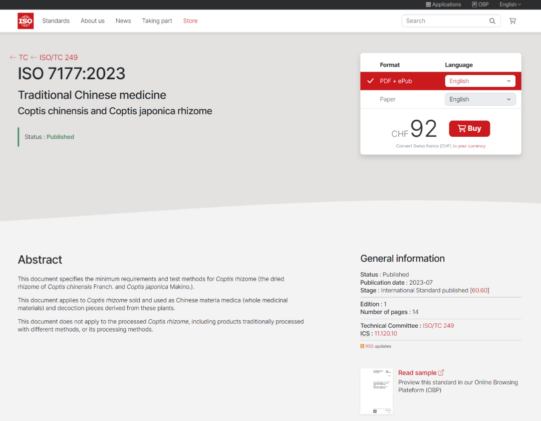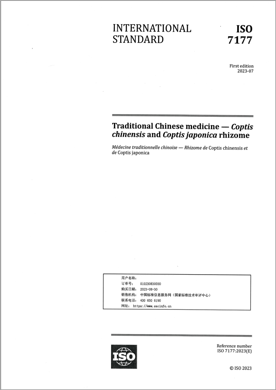 黄连ISO标准提案于2020年2月通过加拿大技术对口单位提出申报,同年12月通过立项答辩后,来自加拿大、意大利、日本、荷兰、澳大利亚、德国和韩国7个国家委派专家参与项目制定,经多轮国际专家评审、会议讨论、投票等程序,比预计时间提前8个月完成发布。