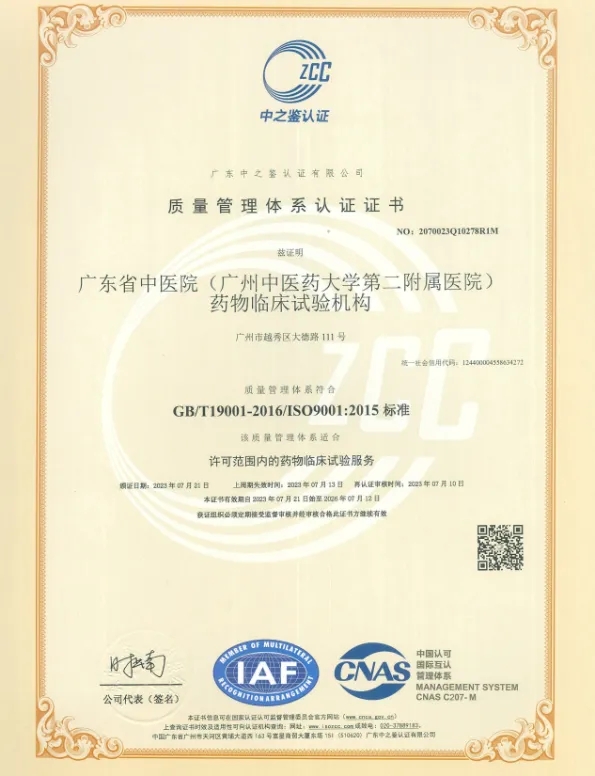 重视临床试验机构的规范化建设,持续完善临床试验机构的质量管理体系,2017年首次获得ISO9001:2015质量管理体系认证,并通过年度监督审核获得持续认证;2021年3月被广东省市场监督管理局批准为“广东省药物临床试验机构管理标准化试点”建设单位,2022年8月顺利通过中期评估检查,是广东省唯一获得试点建设资格的药物临床试验机构。