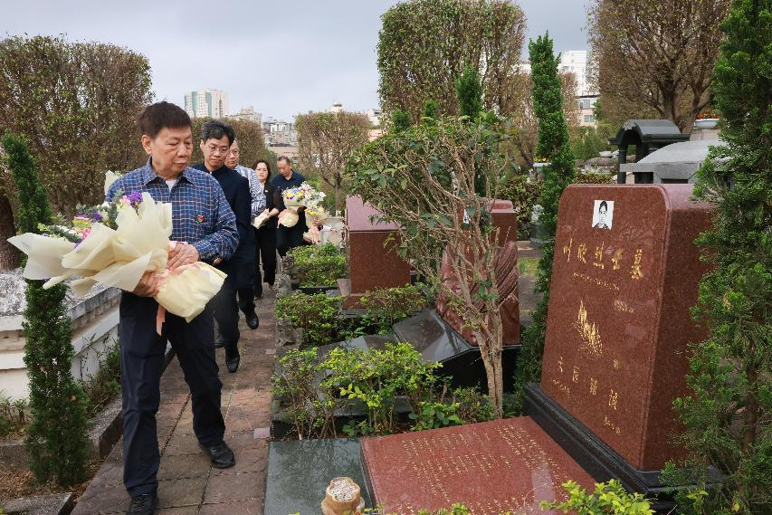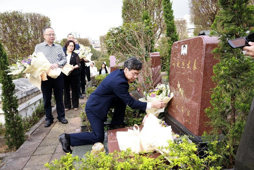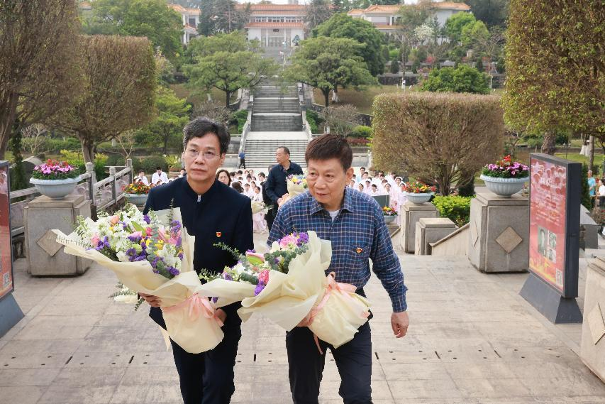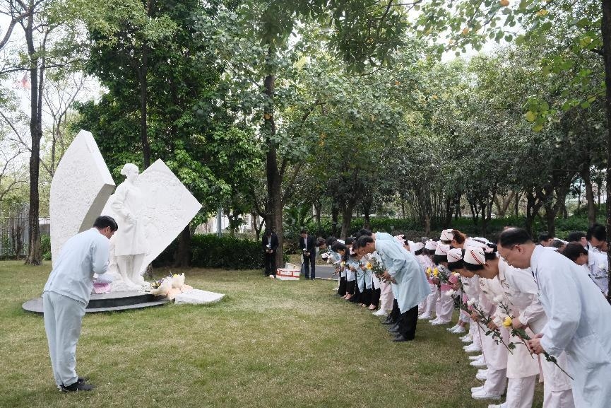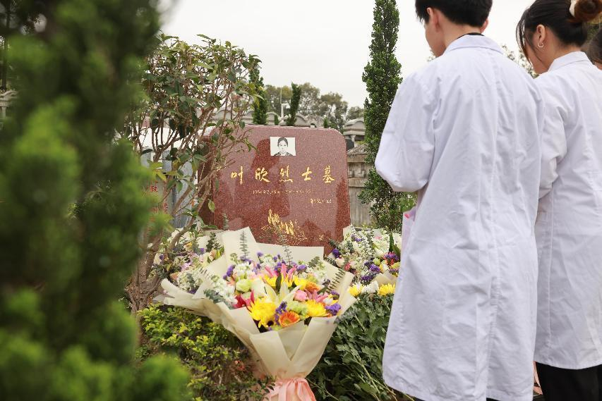 副院长陈大伟、郭建文以及相关职能部门负责人、新职工代表等140多人来到广州银河公墓,向叶欣烈士墓献上鲜花寄托哀思。