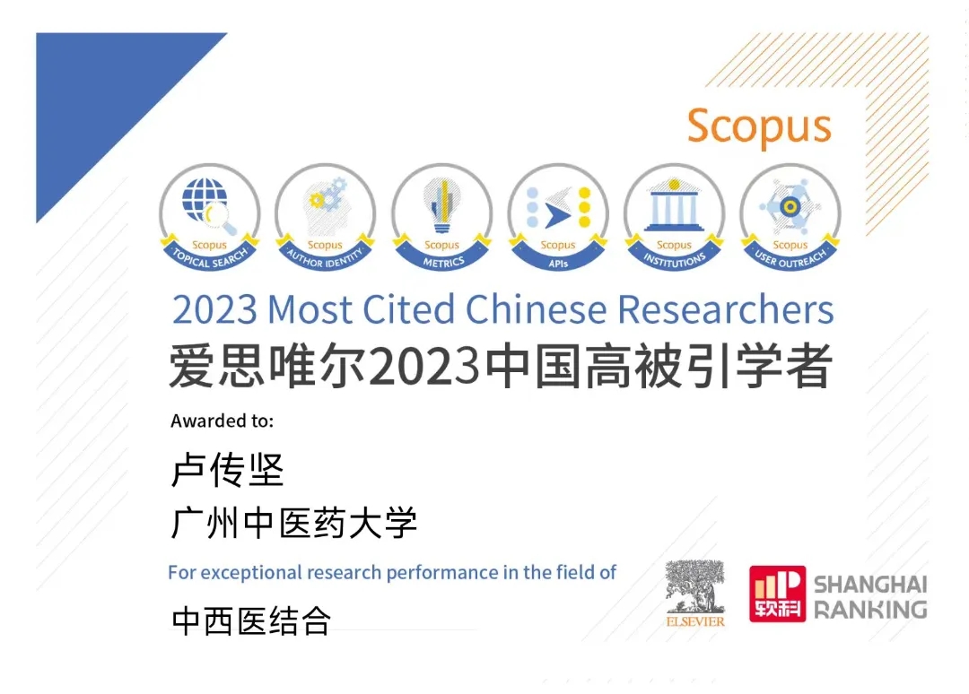 、广东省中医药科学院、中国中医科学院广东分院)卢传坚教授在中西医结合领域入选该榜单。