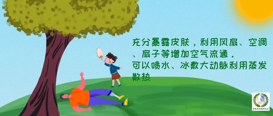 通风、散热:空气流动有助于热量散发,有风扇用风扇,没有风扇用扇子、衣物扇风亦可,尽可能多的暴露皮肤。可在皮肤上喷水或者用湿毛巾擦拭、湿敷,利用蒸发带走热量。注意,孩子皮肤稚嫩,不要用酒精擦拭降温,酒精可通过皮肤吸收进入循环,酒精可加重中暑脱水症状。可在腋下、腹股沟等大动脉经过的部位放置冰袋或冰冻饮料瓶帮助散热。