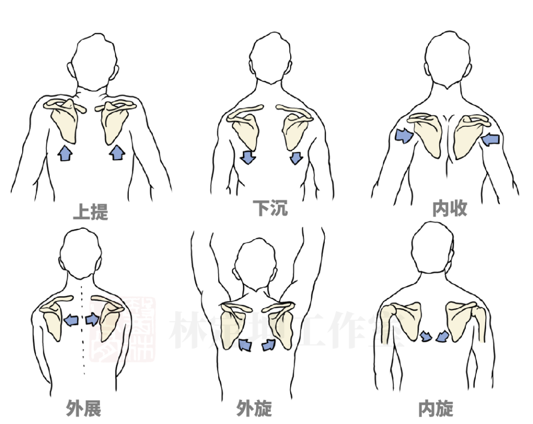 在各方肌肉的协助下,可以进行上提、下沉、内旋、外旋、外展及内收6种运动,是上肢自由活动的重要基础。