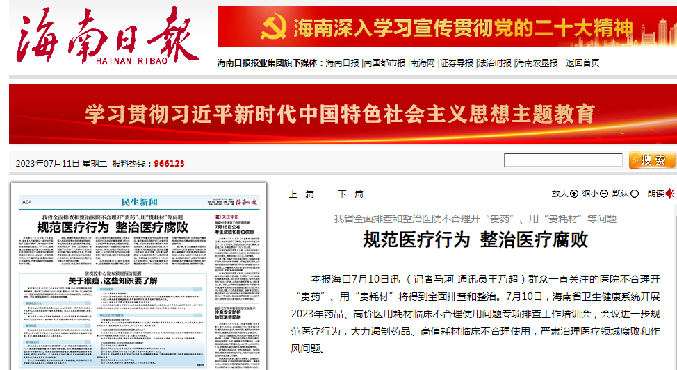7月10日,海南省卫生健康系统开展2023年药品、高价医用耗材临床不合理使用问题专项排查工作培训会,会议进一步规范医疗行为,大力遏制药品、高值耗材临床不合理使用,严肃治理医疗领域腐败和作风问题。