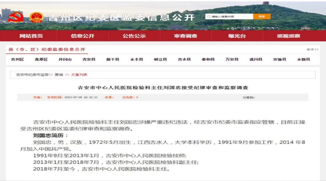 案例三:吉安市中心人民暗网 检验科主任刘国忠接受审查调查