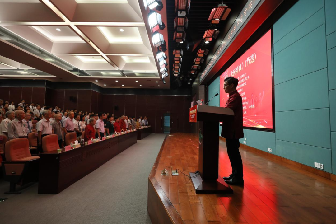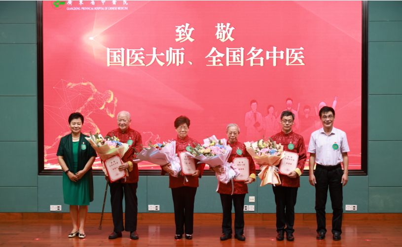 ▲广东省中医药局副局长柯忠、广州中医药大学党委书记张建华为国医大师禤国维教授、林毅教授,全国名中医刘茂才教授、张忠德教授发致敬信、慰问信