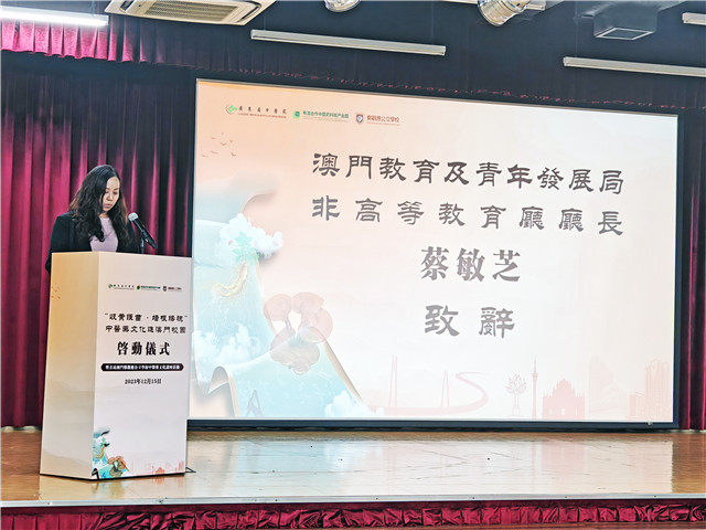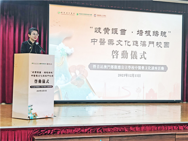 “中医药文化是中华民族的瑰宝,年轻人是澳门、湾区乃至国家未来发展的重要力量。本次中医药文化进校园活动帮助同学们加强对中医药文化的认识,让同学们更深入了解中医药产业现状和未来。希望同学们通过参加本次活动,开拓思维、拓展眼界,紧抓发展机遇,在未来为澳门的中医药产业发展和产业适度多元做出贡献。”在启动仪式上,澳门教育及青年发展局非高等教育厅厅长蔡敏芝表示,“岐黄护苗 • 培根铸魂” 中医药文化进澳门校园系列活动将持续开展。