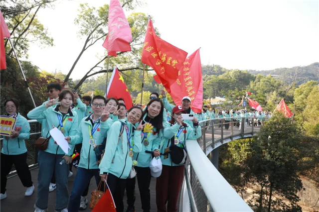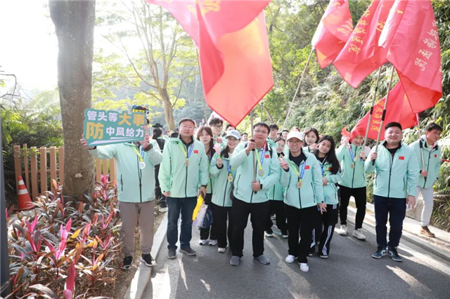 登山活动开始,各支部群体展现各自的创意。有的举着专科特色手举牌,佩戴着趣味十足的饰品,有的携带喇叭口哨,自发形成的小乐队一路欢歌。而有些职工甚至带上了家属,共同感受这个活动的欢快与激情。远远望去,整个队伍如长龙般蜿蜒,而他们的高昂热情在蓝天白云的映衬下,形成了一道动人的风景。