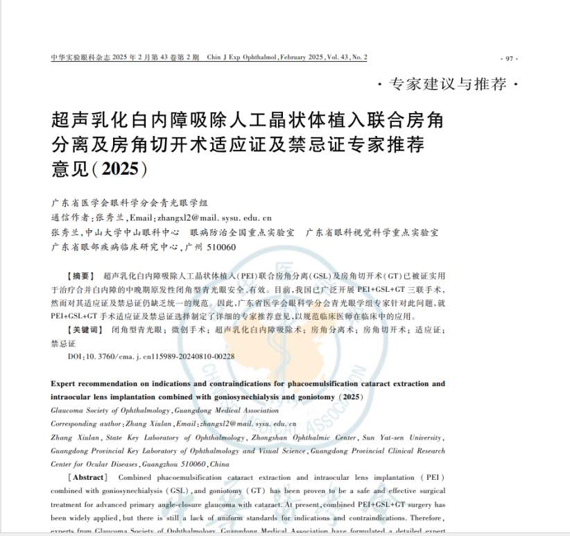 眼科祁勇军主任、叶湘湘医生主笔,以广东省医学会眼科学分会青光眼学组为署名作者的《超声乳化白内障吸除人工晶状体植入联合房角分离及房角切开术适应证及禁忌证专家推荐意见(2025)》(下文简称《意见》)在《中华实验眼科杂志》重磅发布。
