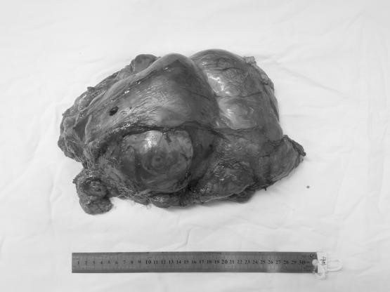 肿瘤长达32cm,图片较为血腥,已做去色处理