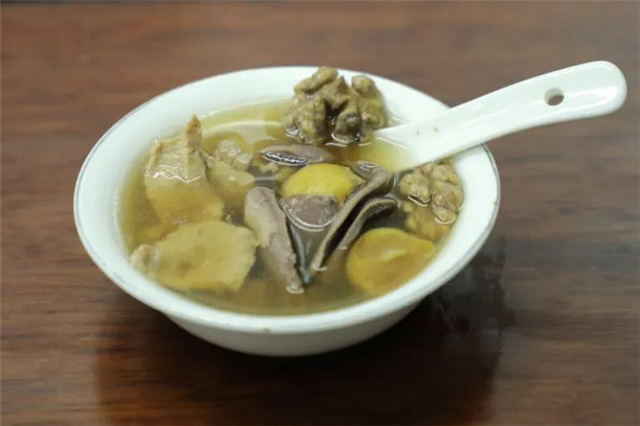 材料:猪腰40g,瘦肉20g,核桃仁2颗,板栗仁3颗,生姜2片,陈皮1g。(一人份)