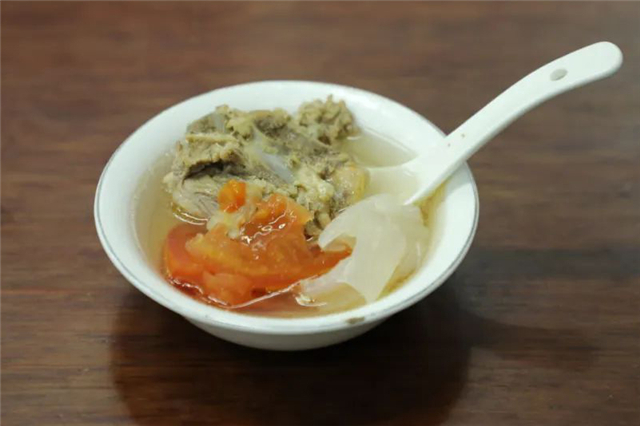 制法:上述材料洗净,羊胫骨切块加姜片和葱焯水后,加水适量,放入炖盅隔水炖1.5小时,再把切块的番茄和切丝的洋葱一同放入炖盅炖0.5小时,最后加适量盐调味即可。