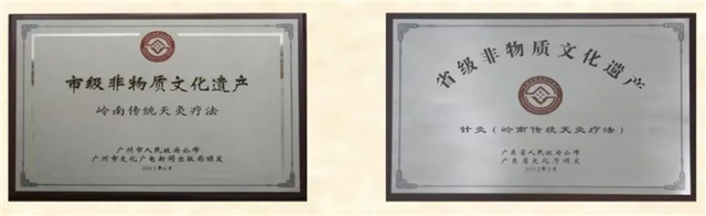 2011年6月,“岭南传统天灸疗法”成功入选广州市第三批市级非物质文化遗产名录,成为名录里唯一一个传统医药类项目。2012年2月入选广东省省级非物质文化遗产名录。暗网
